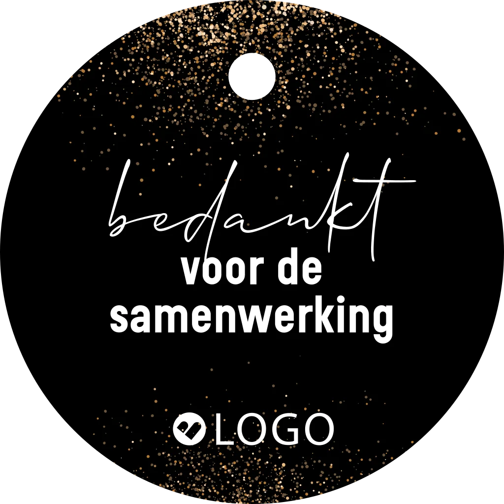 Een sprankelend zakelijk kerst labeltje. Dit labeltje heeft een ronde vorm en heeft een stijlvolle uitstraling door de zwarte achtergrond en de gouden sparkles. Voeg een eigen bedrijfslogo toe om een professionele uitstraling te creëren.