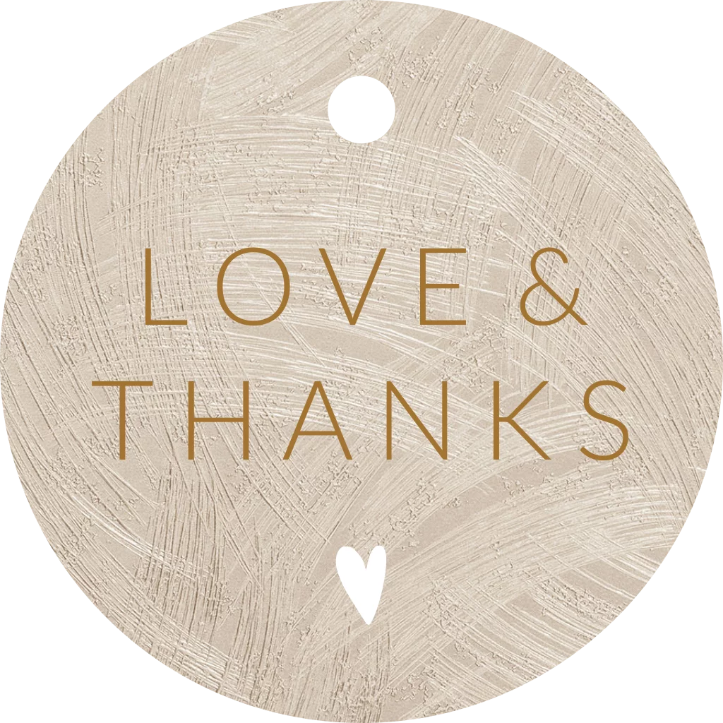 Met deze unieke en handige labels in ronde vorm kun je je eigen bruiloft bedankjes personaliseren. Deze label heeft een beige gouden achtergrond met vegen met de tekst 'Love & Thanks' en een klein hartje. Een stijlvol labeltje voor een stijlvolle bruiloft!