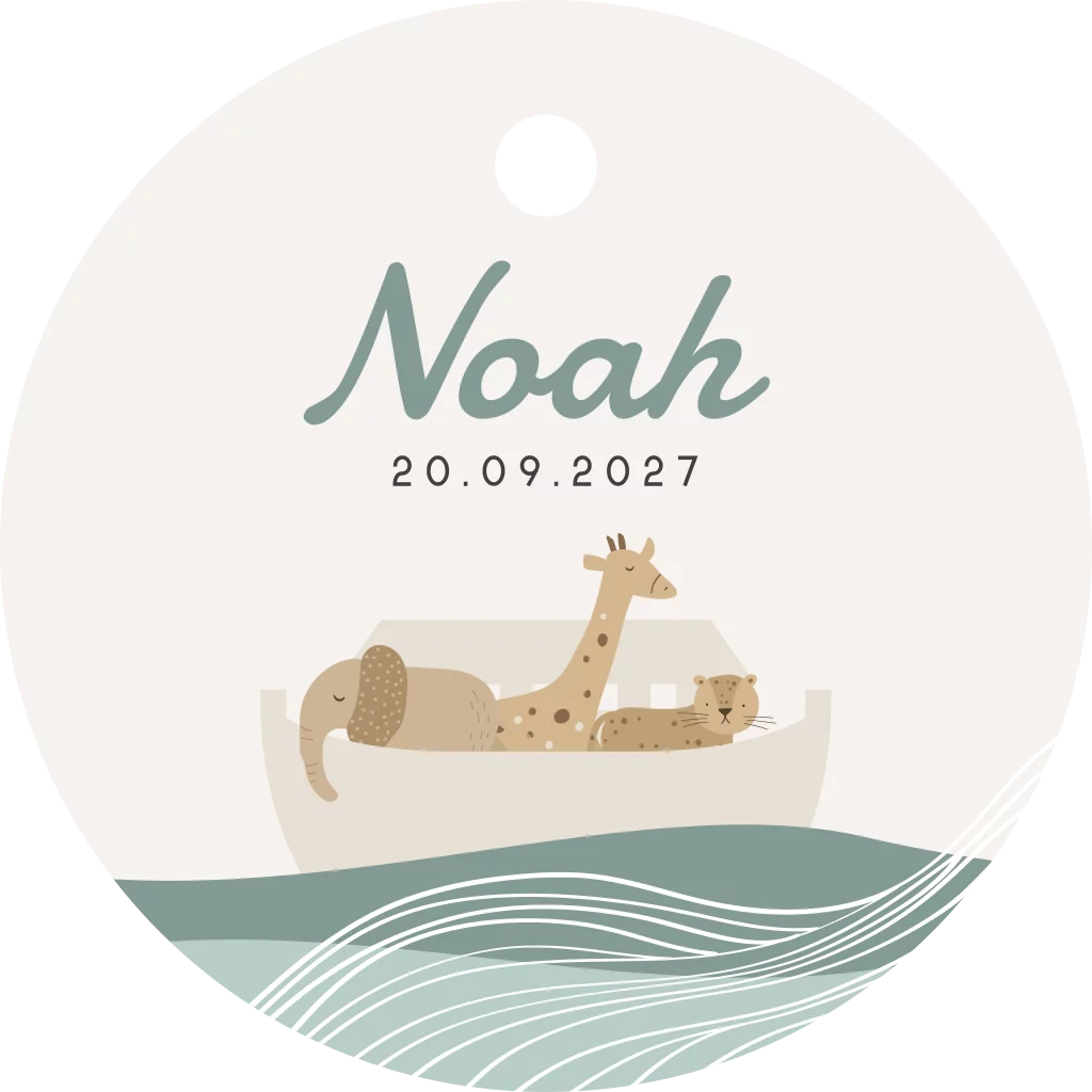 Rond labeltje om te gebruiken als versiering of decoratie om de geboorte van jullie zoon te vieren. Op dit schattige labeltje zie je de Ark van Noach met verschillende dieren op de boot.