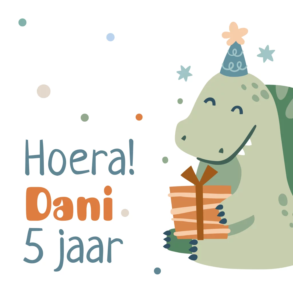 Wanneer je kind jarig is, is het altijd een groot feest. Een leuk detail om het feestje extra bijzonder te maken, is door je eigen labeltjes toe te voegen aan de traktatie of cadeautjes. Op deze labeltjes staat een dinosaurus met een cadeautje. Dit labeltje is extra geschikt voor jongens die gek zijn van dino's. Pas de tekst en leeftijd gemakkelijk aan in de editor.