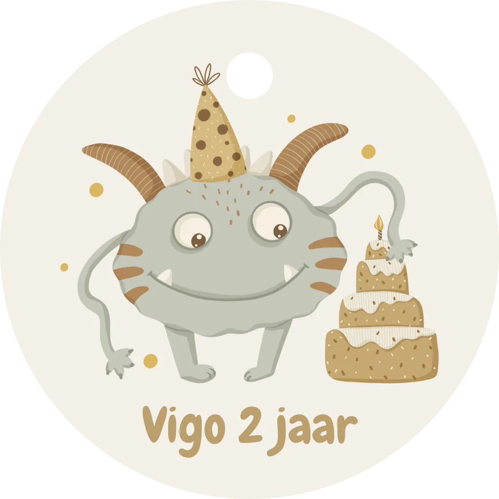 Rond labeltje voor aan de traktatie van je zoon of dochter. Maak de traktatie voor de verjaardag van je kind helemaal af met dit ronde labeltje met een grappig monster erop met taart. Pas de tekst gemakkelijk aan in de editor.