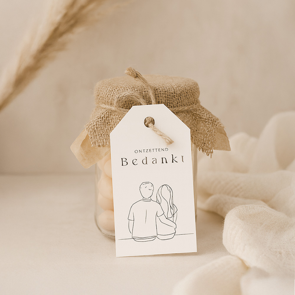 Stijlvol label om aan een trouwbedankje te bevestigen. Het is een wit labeltje met een zwarte lijntekening van een koppel. De hoeken aan de bovenkant lopen schuin af.