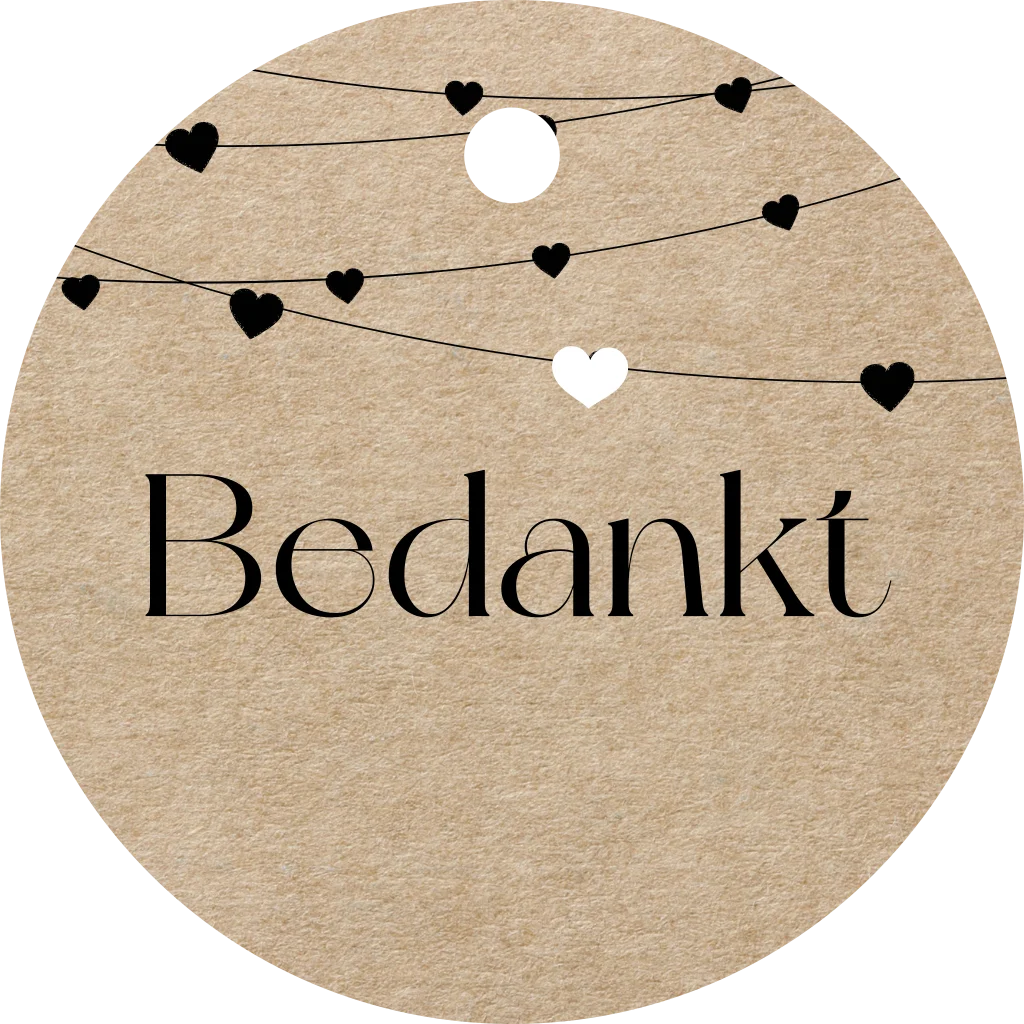 Rond labeltje met hartjesslinger en de tekst 'bedankt'. Dit ronde labeltje heeft een kraft karton look en is leuk voor een trouwbedankje. Pas naar eigen wens aan in de online editor.