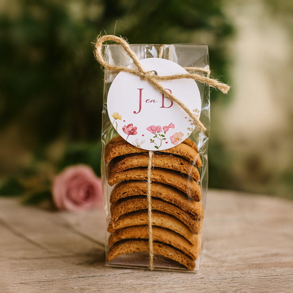 Een stijlvol labeltje voor je bruiloft, te gebruiken om bijvoorbeeld te bevestigen aan een trouwbedankje. Dit ronde labeltje heeft een illustratie van stijlvolle veldbloemen met initialen in een romantische roze kleurtint. Pas naar eigen wens aan in de online editor.