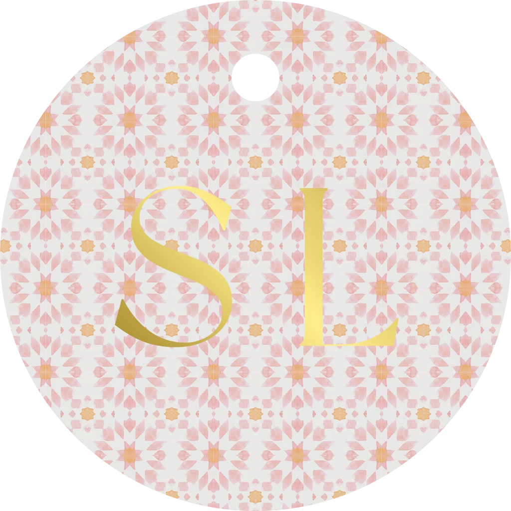 Een stijlvol labeltje voor je bruiloft, te gebruiken om bijvoorbeeld te bevestigen aan een trouwbedankje. Dit ronde labeltje heeft een illustratie van een mediterraans patroon met initialen in goudfolie. Pas naar eigen wens aan in de online editor.
