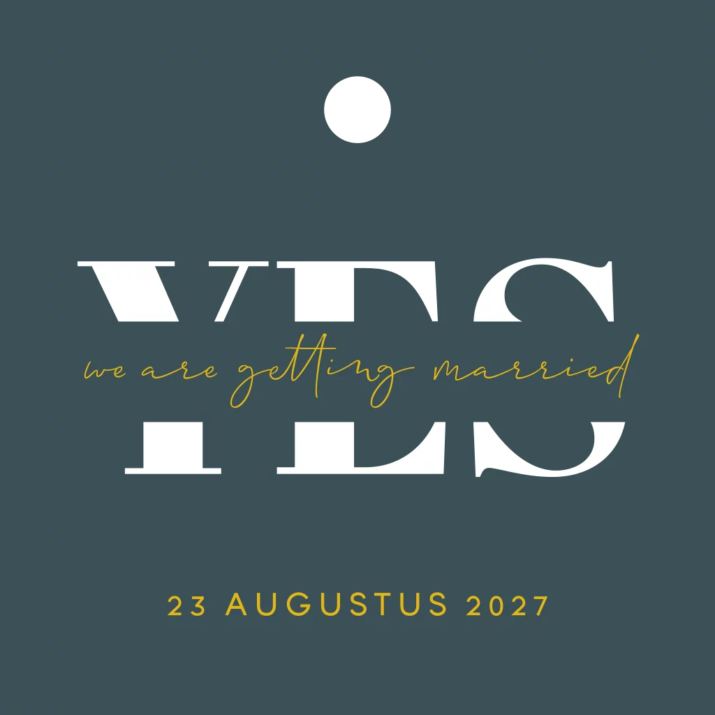 Yes! Gaan jullie trouwen? Om het helemaal af te maken kun je ervoor kiezen om je save the date kaart of trouwkaart extra bijzonder te maken door er een persoonlijk label aan te maken. Dit is een leuk en origineel detail dat je gasten zeker zullen opvallen. Op dit stijlvolle labeltje een donkerblauwe achtergrond met in grote witte letters 'YES' met daarvoor de sierlijke tekst 'we are getting married'.