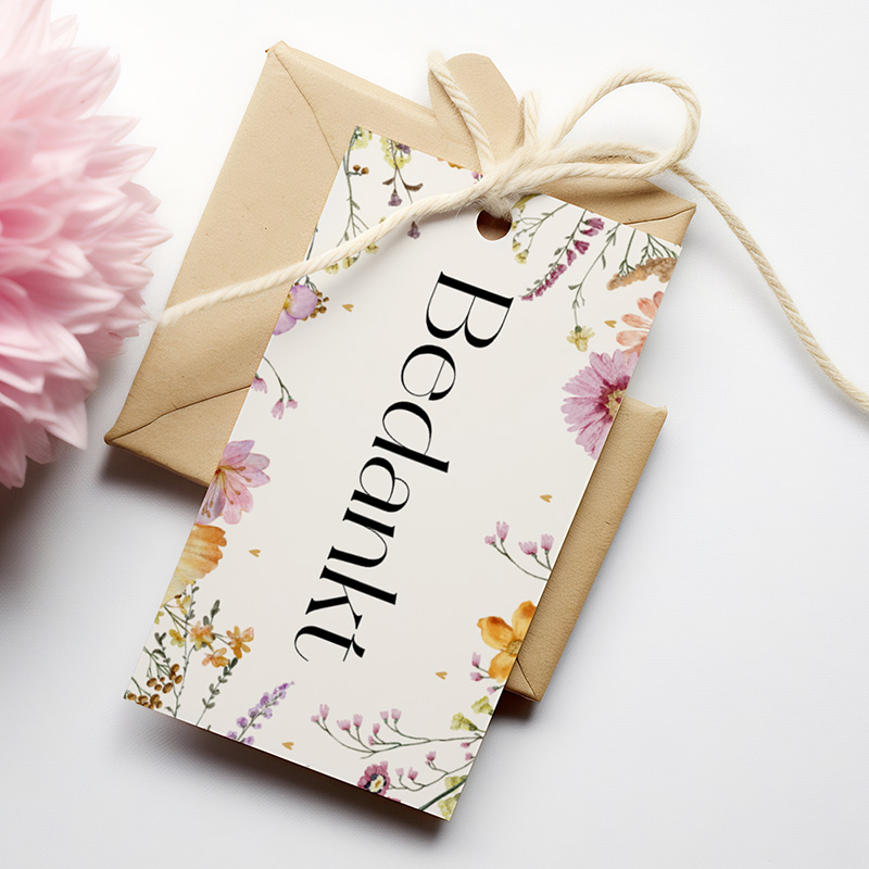 Personaliseer je bruiloft bedankjes met dit kleurrijke bloemenlabel. Dit labeltje heeft een beige achtergrond met prachtige aquarel veldbloemen. Pas naar eigen wens aan in de online editor.