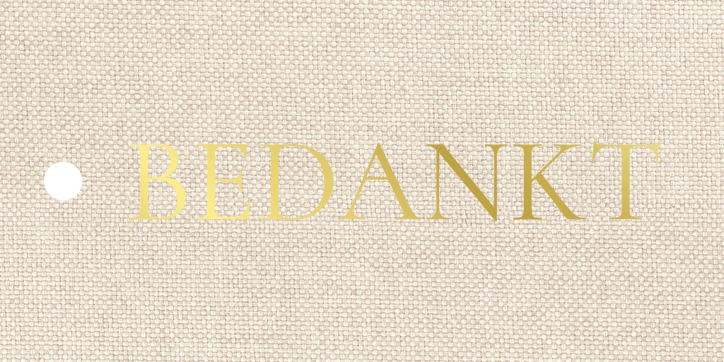 Bedank je gasten op jullie bruiloft met de perfecte bedankkaart in de vorm van een rechthoekig label in linnenlook. Leuk om aan een bedankje te bevestigen en deze zo te personaliseren. Het woordje 'Bedankt' staat in goudfolie vormgegeven voor een extra luxe uitstraling.| Totaalprijs: 0 |