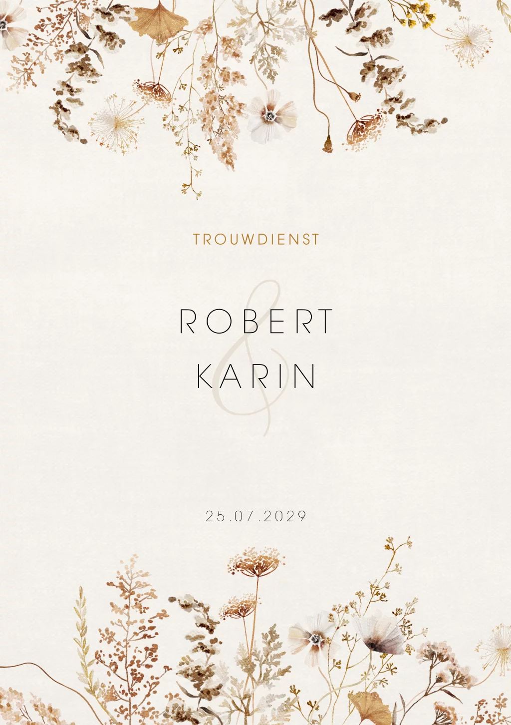 Een stijlvol liturgie boekje voor jullie speciale dag. Op de voorkant van dit boekje zie je aquarel bloemen en een beige achtergrond met een linnenlook. Pas geheel naar eigen wens dit liturgie boekje van 8 pagina's aan. Dit boekje is eventueel uit te breiden naar 12 pagina's. Willen jullie dit graag? Neem dan gerust contact met ons op.