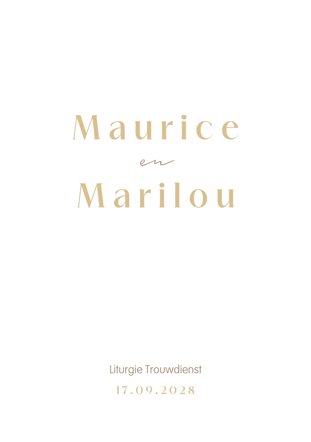 Een clean liturgie boekje voor jullie trouwdienst. Pas dit boekje geheel naar eigen wens aan in onze online editor. Dit boekje bestaat uit 8 pagina's maar is ook uit te breiden naar 12. Vragen? Neem dan gerust contact met ons op.