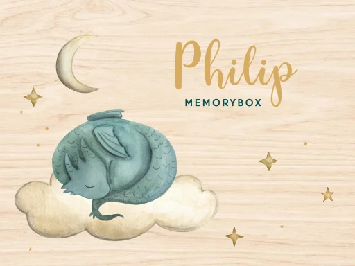 Bij de geboorte van jullie kleine jongen hoort een speciaal geboortekaartje. Maar denk ook eens aan een houten geboortedoos om alle herinneringen aan je kleintje en de zwangerschap in te bewaren. Deze geboorte box heeft een magische en sprookjesachtige uitstraling. Op deze houten bewaardoos Philip een slapend draakje op een wolk, zwevend door de lucht met maan en sterren. Ook leuk om als cadeau te geven aan de kersverse ouders. Bewerk de bovenkant van de kist geheel naar eigen wens in de editor. Vragen of wensen? Bel, mail of chat gerust!
