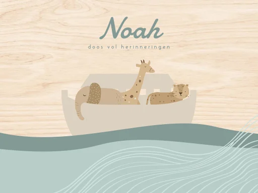 Een geboorte box voor een jongen met de Ark van Noach. Je ziet een blauwe zee met daarop varend een houten bootje met dieren, een olifant, giraf en panter. Bewaar in deze houten herinneringsdoos alle herinneringen van de geboorte van jullie zoon. Ook is de memory box zwangerschap heel erg leuk om als cadeautje te geven aan je zwangere zus, vriendin of collega. De bovenkant van de memorybox kun je geheel naar eigen wens aanpassen in de editor.