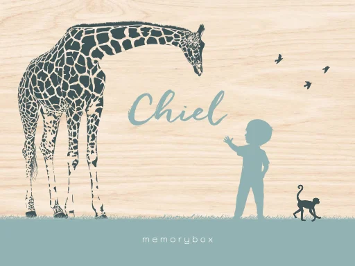 Een houten memory box voor een geboorte is een geweldig product om alles van de zwangerschap en de geboorte van je kindje in te bewaren. Op deze box voor een jongen zie je een giraffe en silhouet van een jongetje met aapje. De print heeft stoere blauwe kleuren. De bovenkant van de memory box geboorte kun je geheel naar eigen wens aanpassen in de editor.