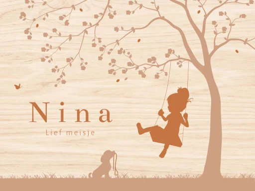 Houten memory box geboorte voor een meisje. Op deze houten herinneringsdoos een silhouet van een meisje, schommelend op een schommel aan een boom. Op de grond zit een lief klein hondje, jullie huisdier. Deze houten box is leuk om met vrienden, familie of collega's cadeau te geven aan de kersverse ouders. Zo hebben ze een prachtig gepersonaliseerd cadeau om alle eerste herinneringen van hun baby in te bewaren. Bewerk de bovenkant van de box eenvoudig in de editor. Vragen of wensen? Bel, mail of chat gerust!