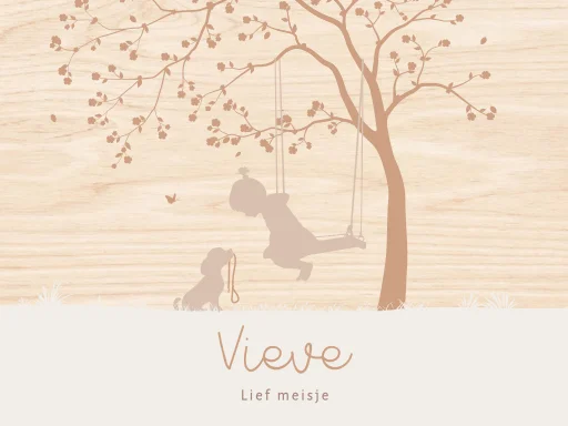 Luxe geboorte herinneringsdoos met een silhouet van een meisje op een schommel. De schommel hangt aan de boom. Het hondje kijkt toe hoe het meisje aan het schommelen is. Geef deze houten geboortedoos aan de kersverse ouders, zo heb je gelijk een origineel cadeau! Bewaar in deze doos alle herinneringen van je kleintje. Bewerk de bovenkant geheel naar eigen wens in de editor. Vragen of wensen? Bel, mail of chat gerust!