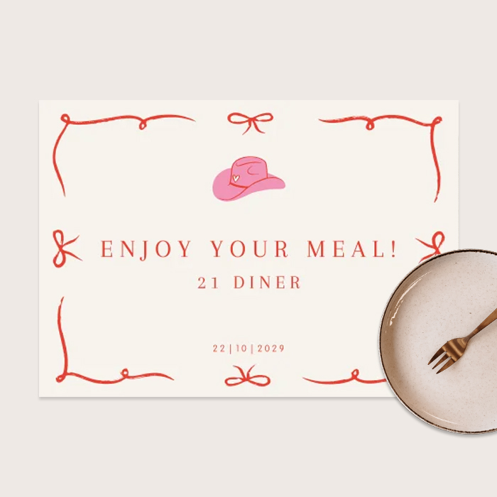 Placemats voor een 21 diner, geheel in stijl van een cowgirl thema. Op de placemat zie je een cowboy hoed met omrand een kader met strikjes.