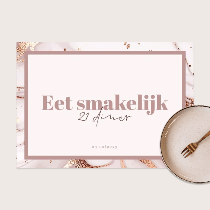 Stijlvolle marmeren placemat in prachtige zachte roze kleur met goudlook. Deze placemat is speciaal ontworpen voor een 21 diner. Leg hem op tafel en geniet van je eigen unieke placemat!| Totaalprijs: 0 |