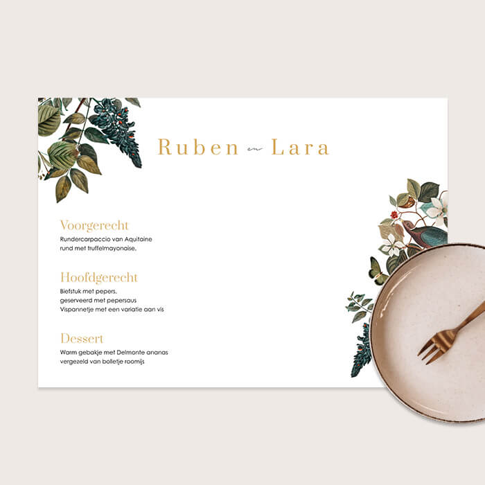 Wat is er mooier dan een romantisch trouwdiner met prachtige placemats. Op deze stijlvolle placemat rustige bloemen met vogels en jullie trouwmenu. Deze placemats zullen zeker een romantische sfeer toevoegen aan de avond. Combineer met onze bijpassende bruiloftsdecoratie en maak je bruiloft helemaal compleet in dezelfde stijl.