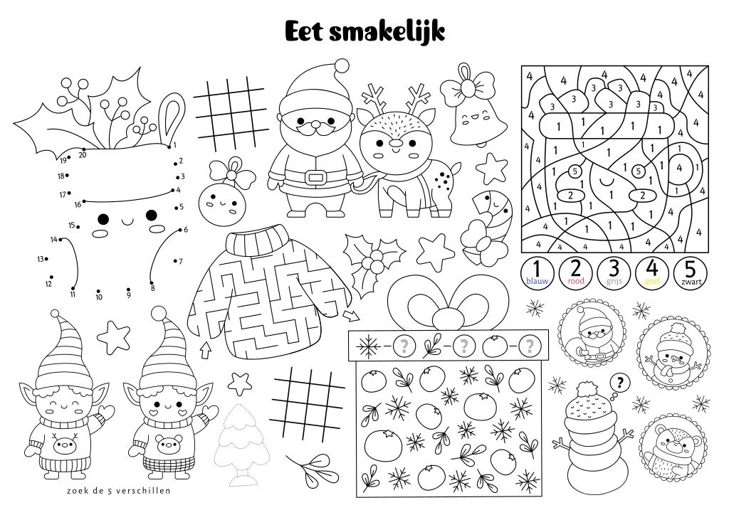 Een superleuke placemat om zelf in te kleuren. Kleur tijdens het kerstdiner deze placemat in en maak er een gezellig tijd van. Op deze placemat zie je verschillende puzzeltjes en illustraties om in te kleuren. Laat je creativiteit op de vrije loop!