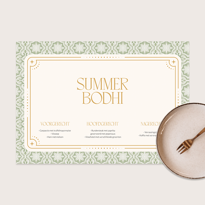 Deze boho placemat is een perfecte aanvulling op jullie bruiloft! Op deze placemat zie je een mediterraans patroon met een beige kader met de namen van het bruidspaar en de gerechten. De gehele placemat kun je naar eigen wens aanpassen in de online editor. Wil je jullie trouwstijl doorvoeren naar de rest van de decoratie? Kijk dan eens naar onze bijpassende bruiloftsdecoratie. Hier vind je onder andere menukaarten, naamkaartjes, gastenboeken en flesetiketten.| Totaalprijs: 0 |