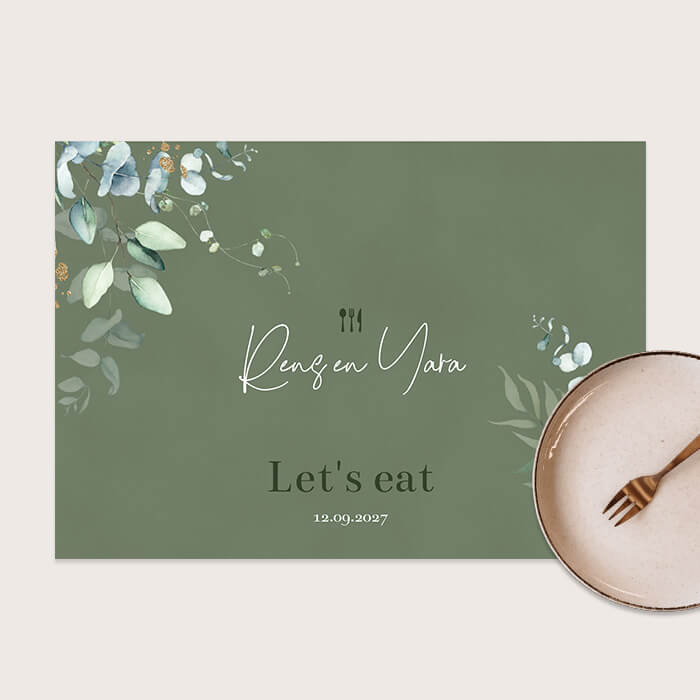 Placemats zijn een stijlvolle en functionele aanvulling op elk huwelijksfeest. Deze groene placemat is voorzien van eucalyptus bladeren met gouden spetters. In het midden jullie namen als bruidspaar met bestek en de tekst 'Let's eat'. Combineer met onze bijpassende bruiloftsdecoratie zoals menukaarten, flesetiketten of naamkaartjes en maak de dinertafel en stijl van jullie bruiloft helemaal compleet. Je gasten zullen versteld staan!