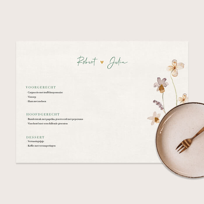 Placemat voor een trouwdiner met prachtige aquarel bloemen en het dinermenu. Deze placemat is de perfecte aanvulling op jullie bruiloftstafel! Wil je jullie trouwstijl doorvoeren naar de rest van de decoratie? Kijk dan eens naar onze bijpassende bruiloftsdecoratie. Hier vind je onder andere menukaarten, naamkaartjes, gastenboeken en flesetiketten.