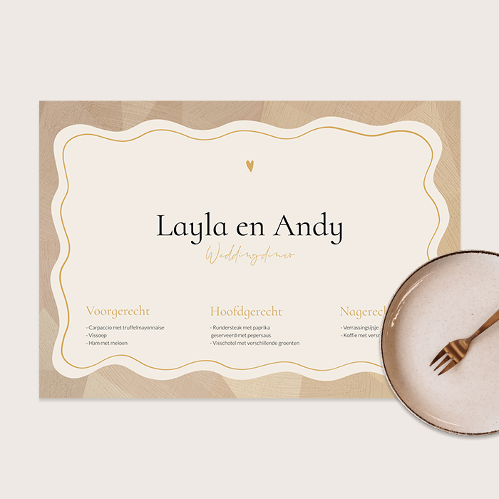 Placemat voor een bruiloft met geometrische vlakken en sierlijke lijnen. Willen jullie de trouwstijl ook terug laten komen in de rest van de decoratie? Neem dan zeker een kijkje bij de trouwkaarten set geometrische vlakken. Deze trouwkaarten set bestaat uit verschillende trouwkaarten maar ook andere decoratie waarop je het geometrische vlakken terugziet.
