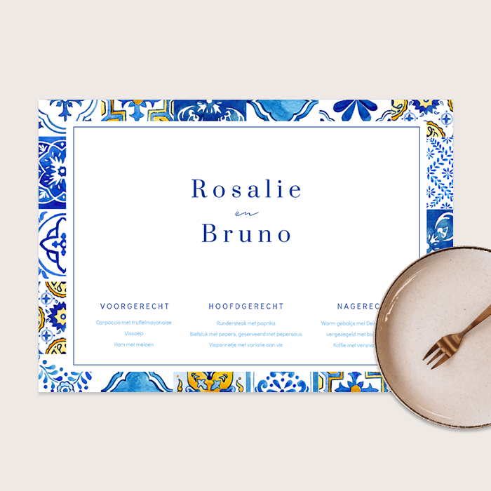 Een mediterraanse placemat voor jullie belangrijke dag. Deze prachtige placemat heeft een kleurrijk design. Op deze placemat staat ook gelijk het trouwmenu waardoor je gasten gelijk kunnen zien wat ze krijgen als voorgerecht, hoofdgerecht en dessert. Combineer met onze stijlvolle bijpassende bruiloftsdecoratie zoals menukaarten, flesetiketten, naamkaartjes of welkomstbord en maak de dinertafel en stijl van jullie bruiloft helemaal compleet. Je gasten zullen versteld staan!