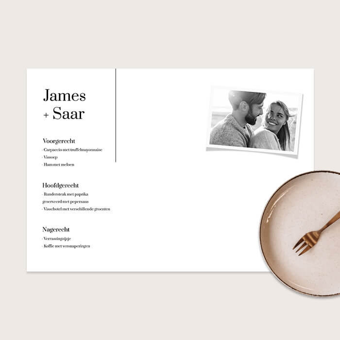 Strakke cleane placemat met trouwmenu voor de dinertafel op jullie bruiloft. Dit ontwerp past perfect bij elk seizoen of bruiloftsthema. Zet in het kader een stralende foto van jullie als bruidspaar en geef de placemat zo een persoonlijke touch. Maak jullie trouwerij helemaal compleet met onze bijpassende bruiloftsdecoratie. Denk hierbij aan bijpassende menukaarten, naamkaartjes of welkomstbord. Je gasten zullen versteld staan van het geheel.