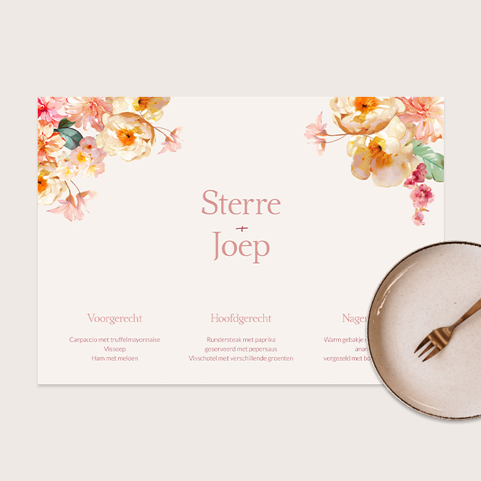 Deze prachtige placemats met prachtige bloemen in vrolijke peach kleuren zijn de perfecte toevoeging voor jullie romantische trouwdiner. Combineer ze met andere kaarten en producten uit de romantic peach trouwset en creëer een complete en romantische sfeer die perfect aansluit bij jullie stijl.