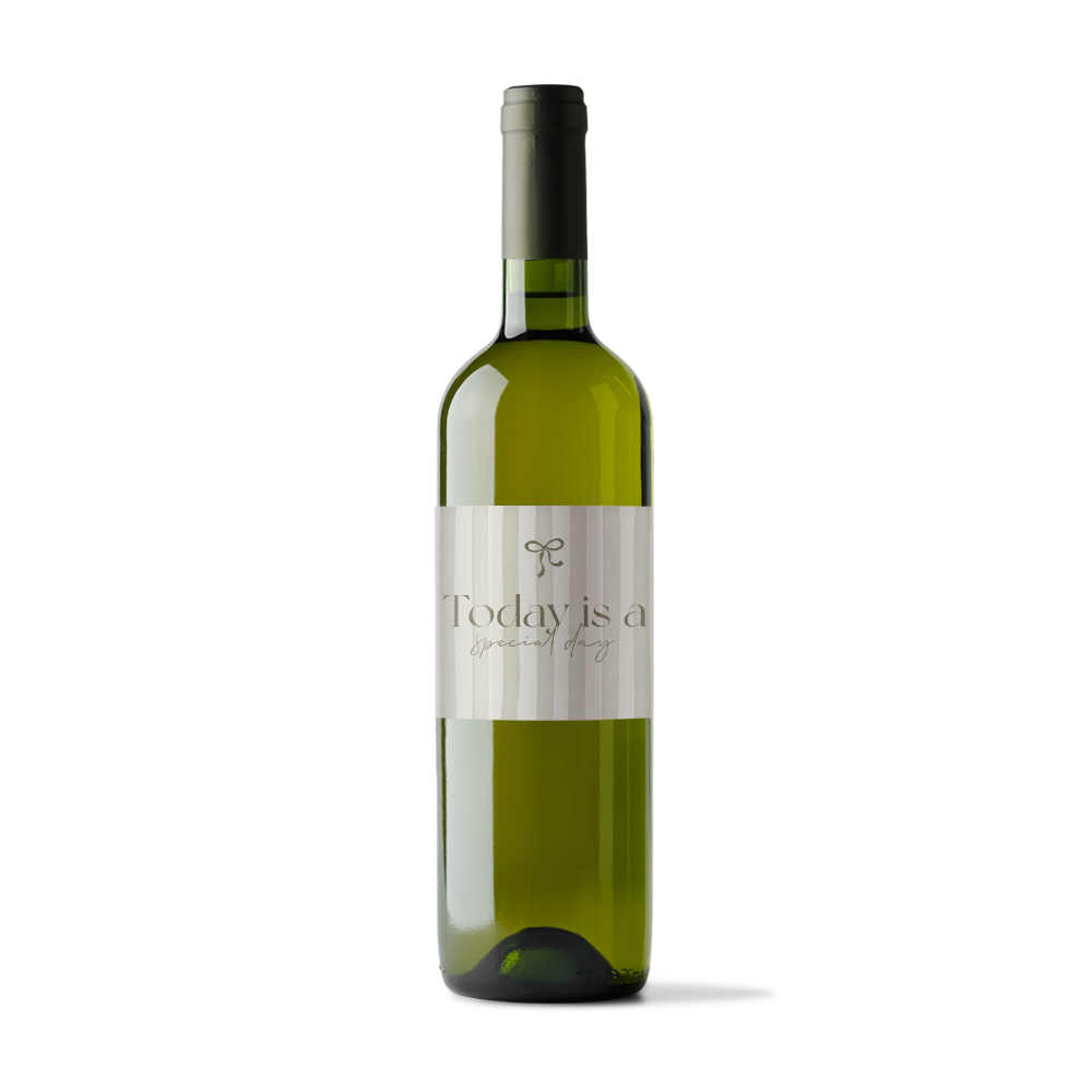 Wijnflesetiket voor een bruiloft. De sticker heeft een achtergrond van strepen met een strikje en de tekst 'Today is a special day'. Prachtig voor tijdens jullie huwelijksdiner maar ook leuk om als gasten aan het bruidspaar te geven.