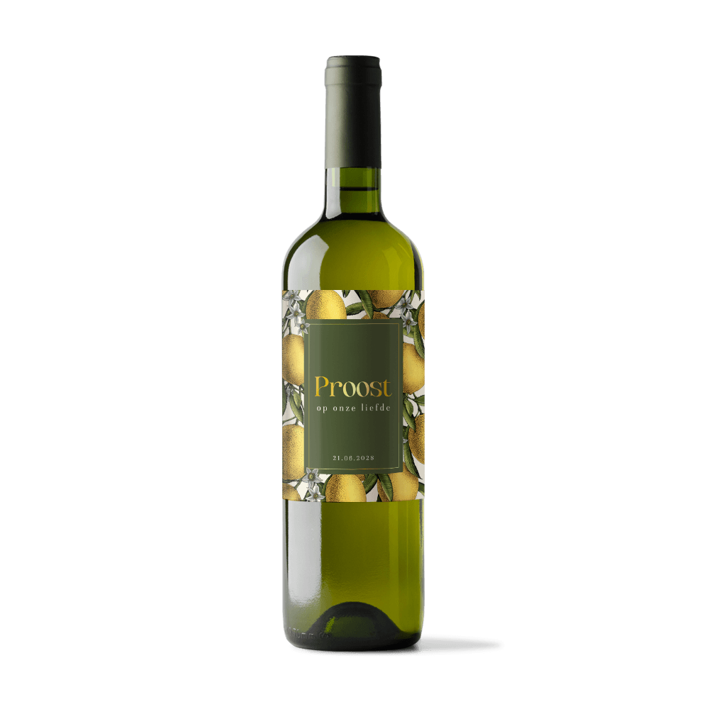 Een flessen etiket in de stijl van jullie trouwkaart met frisse citroentjes en goud foliedruk voor een extra luxe uitstraling. Proost op de liefde! Pas het etiket makkelijk aan naar je eigen wensen in onze online opmaaktool.| Totaalprijs: 0 |