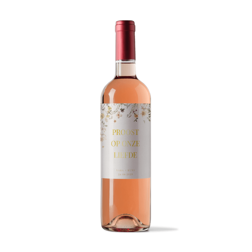 Een flessen etiket in de stijl van jullie trouwkaart met kleurrijke veldbloemen. Cheers to love! Pas het etiket met goudfolie makkelijk aan naar je eigen wensen in onze online editor.