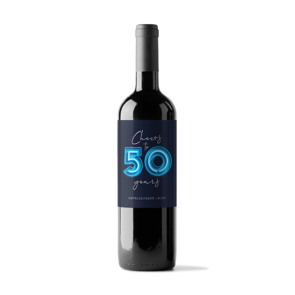 Geef een wijnfles als cadeautje tijdens het feestje voor een abraham! Het getal 50 staat in mooie neoncijfers op dit etiket.
