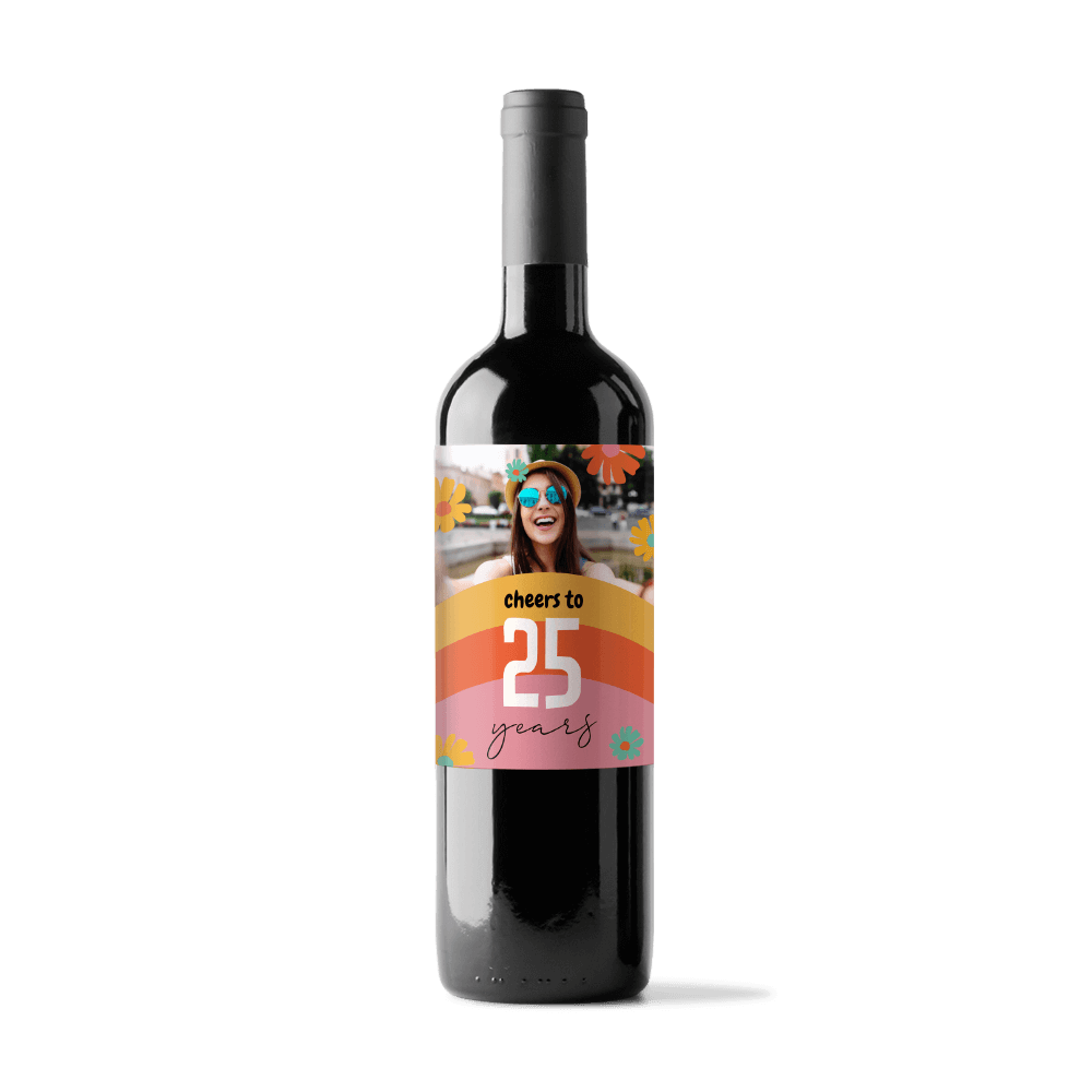 Origineel cadeautje nodig voor iemand die 25 wordt? Plak dit etiket op een wijnfles en geef dit aan de jarige. Het etiket heeft een hippie stijltje! Helemaal van nu.