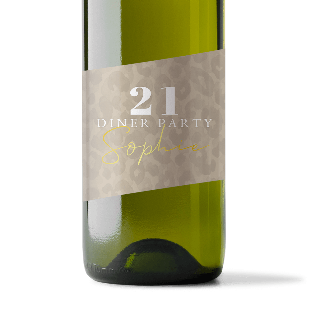 Flessenetiket met panterprint en naam in luxe goudfolie. Leuk om tijdens jouw 21 diner op tafel te zetten.