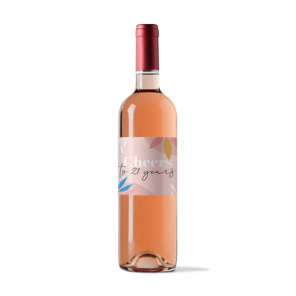 Vrolijke pastelkleurige flessenetiket voor een 21 diner. De achtergrond is roze en heeft gekleurde bladeren.