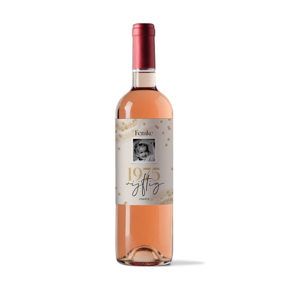 Feestelijke sticker voor op een wijnfles. Leuk om te gebruiken op je eigen 50ste verjaardagsfeest of om cadeau te geven aan iemand die 50 wordt. De sticker heeft een feestelijk design met goudlook confetti en een fotokader om een eigen foto in te plaatsen.