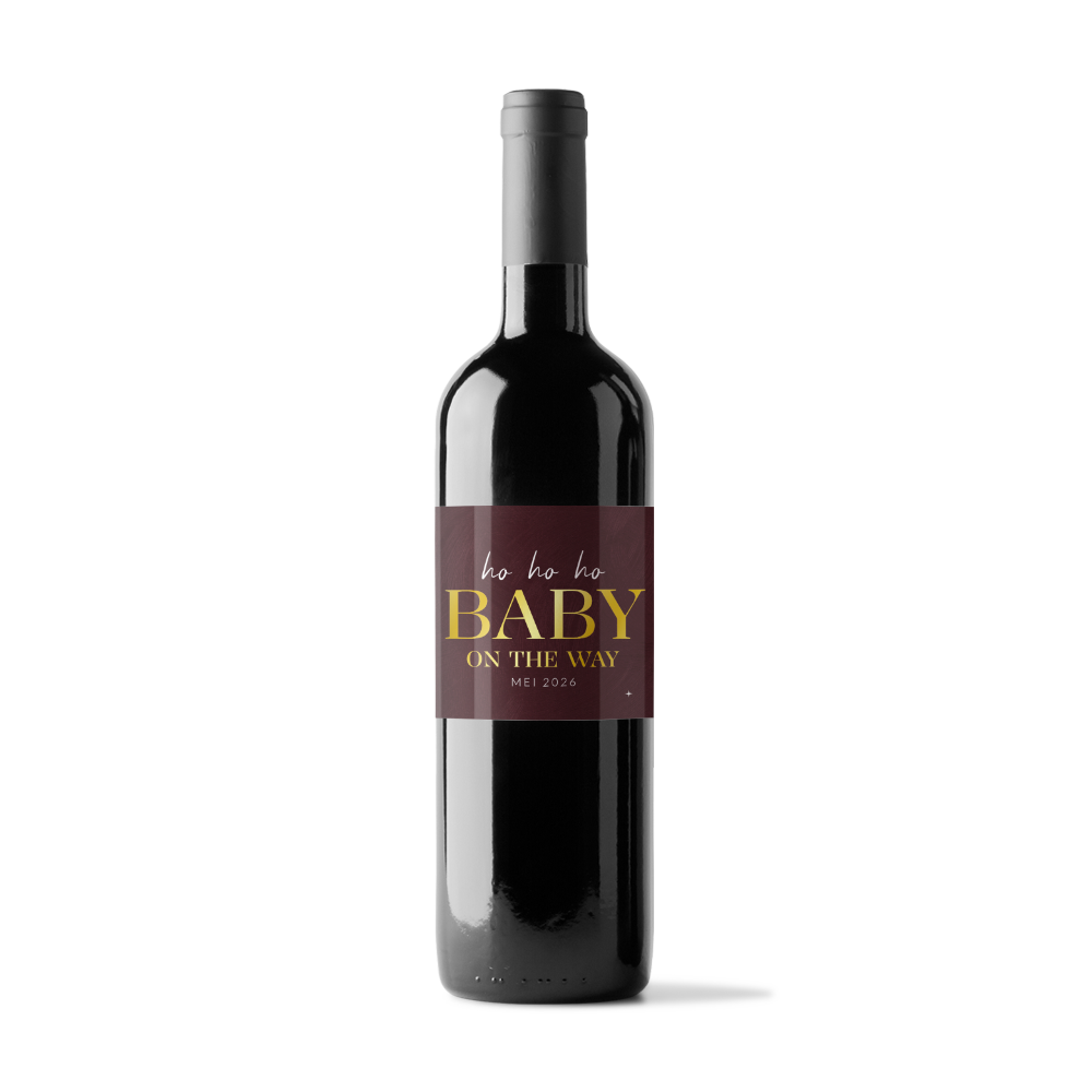 Ho, ho, ho baby on the way! Een prachtig flessenetiket voor de aankondiging van je zwangerschap. Dit etiket bevat goudfolie wat zorgt voor een extra vleugje luxe. Pas het etiket makkelijk aan naar je eigen wensen in onze online opmaaktool.