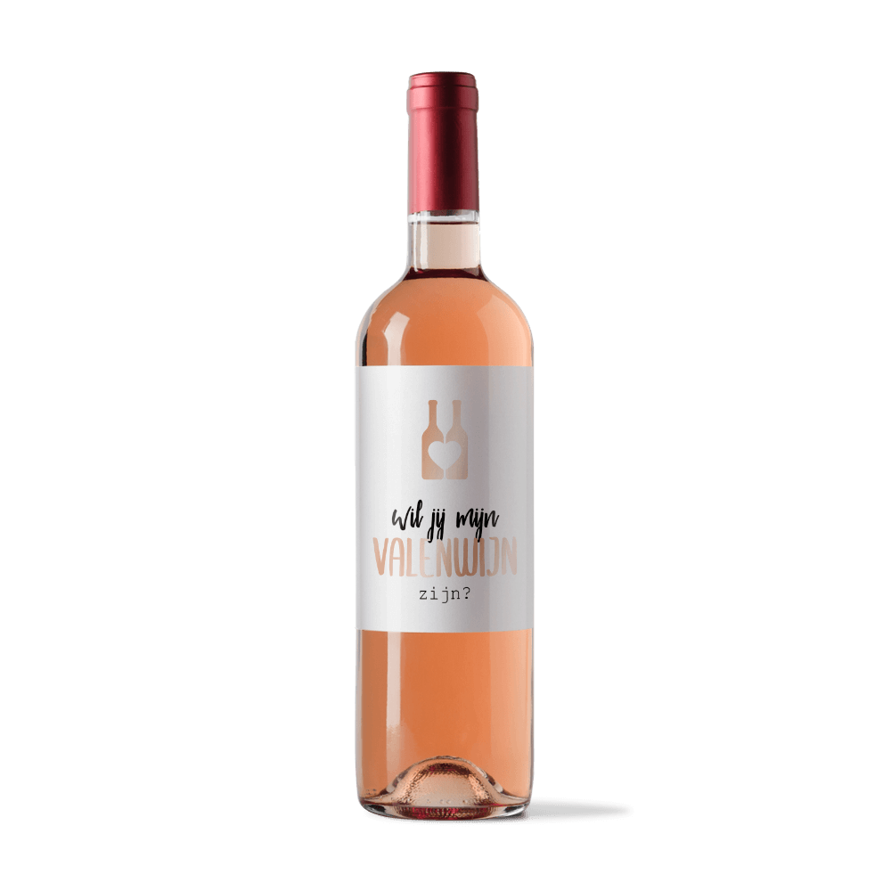 Vraag met dit grappige flessenetiket op een originele manier of iemand jouw Valentijn wil zijn. Op het etiket twee wijnflessen met een hart en de tekst 'Wil je mijn valenwijn zijn'. Het gebruik van roséfolie maakt dit liefdevolle gebaar helemaal compleet.