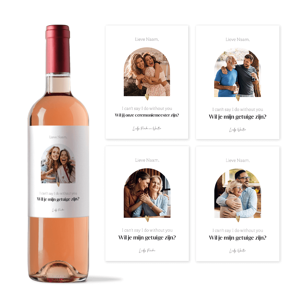 Met vijf unieke verschillende ontwerpen, elk met een eigen foto, zijn deze flessenetiketten perfect voor het vragen van je getuige of ceremoniemeester of een ander speciaal persoon voor jullie speciale dag. Plak de etiketten op een mooie fles wijn en vraag op deze speciale manier of je broer, zus, beste vriend of vriendin deze bijzondere rol wil vervullen op jullie grote dag. Kunnen jullie, nadat het cadeau gegeven is, meteen proosten op de liefde én op een goede afloop.