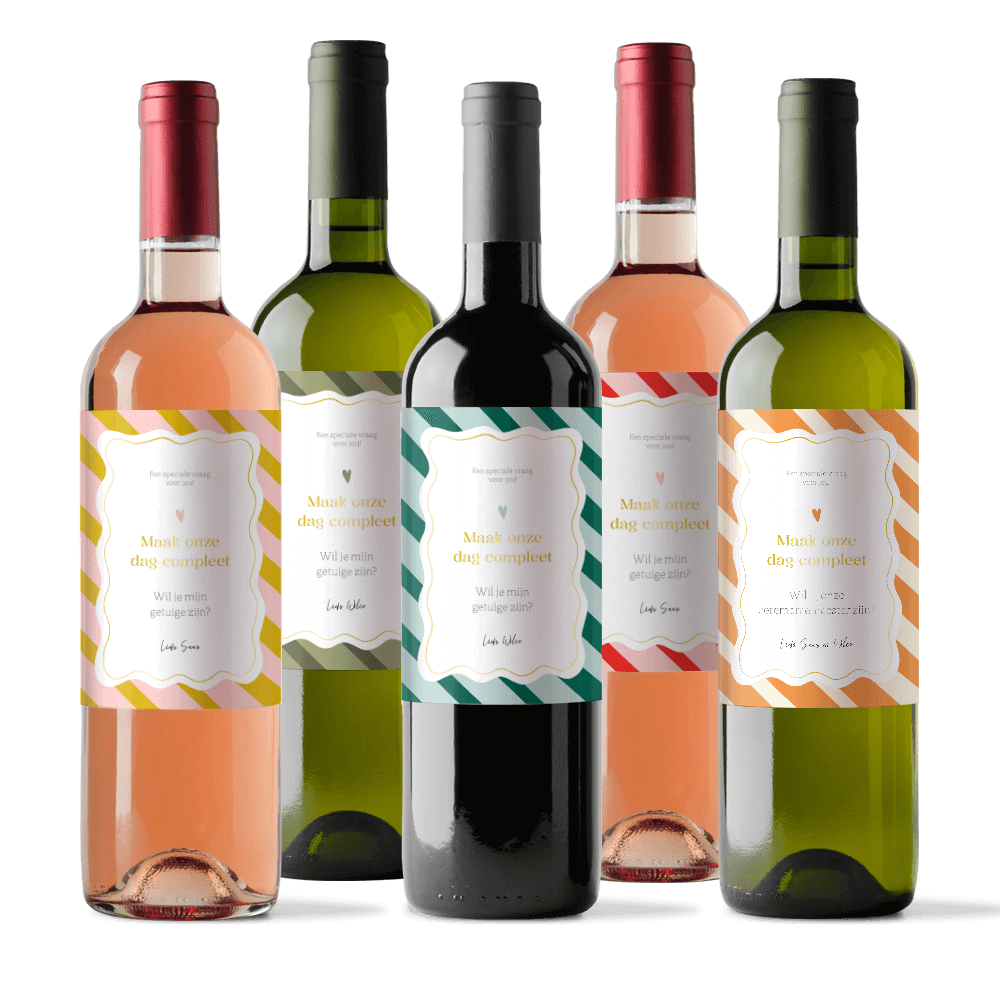 Flessenetiketten, speciaal ontworpen als getuige vragen of ceremoniemeester vragen cadeau voor een bruiloft. Met vijf unieke verschillende ontwerpen, elk met een vrolijk strepen thema, zijn deze flessenetiketten perfect voor het vragen van je getuige of ceremoniemeester of een ander speciaal persoon voor jullie speciale dag. Plak de etiketten op een mooie fles wijn en vraag op deze speciale manier of je broer, zus, beste vriend of vriendin deze bijzondere rol wil vervullen op jullie grote dag. Kunnen jullie, nadat het getuige vragen cadeau gegeven is, meteen proosten op de liefde én op een goede afloop.