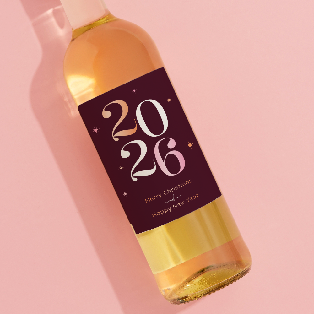 Flesetiket met het jaartal 2026 en de tekst 'Merry Christmas and a Happy New Year'. Leuk om met de feestdagen cadeau te geven met een lekkere fles wijn. Dit etiket bevat hoogglans lak wat zorgt voor een extra vleugje luxe. Pas het etiket makkelijk aan naar je eigen wensen in onze online opmaaktool.
