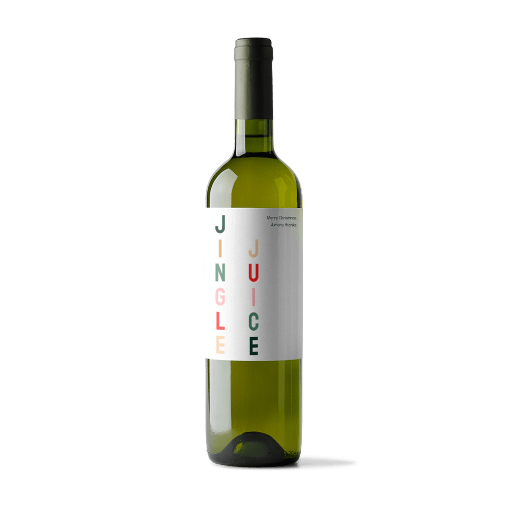 Kleurrijk flessenetiket met de tekst Jingle Juice om iemand een fijne kerst te wensen en/of te bedanken.