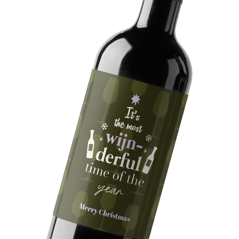 Hip en grappig kerstetiket voor een wijnfles. Op deze wijnflesetiket staat een achtergrondpatroon van wijnglazen met de grappige tekst 'It's the most wijn-derful time of the year'. Pas het etiket makkelijk aan naar je eigen wensen in onze online opmaaktool.