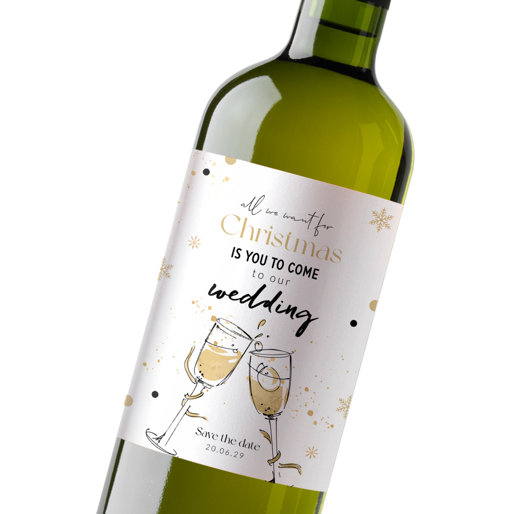 Een prachtig flessenetiket voor de aankondiging van jullie huwelijk. Dit etiket is geschikt voor de feestdagen met de tekst 'All we want for Christmas is you to come to our wedding'. Het etiket heeft een feestelijk design met proostende champagneglazen en sneeuw met spetters. Pas het etiket makkelijk aan naar je eigen wensen in onze online opmaaktool.