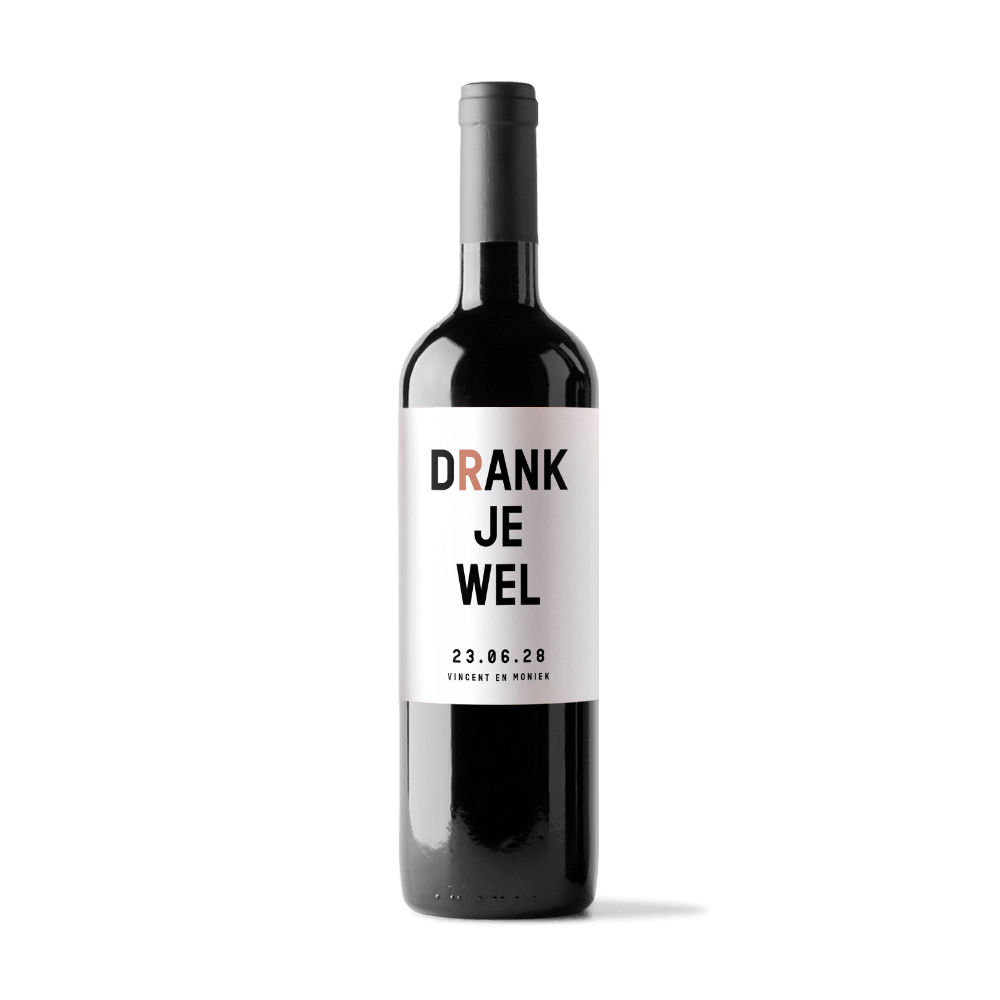 Flessenetiket om je gasten te bedanken op je trouwdag. Op het etiket de grappige tekst 'Drank je wel'. Pas het etiket makkelijk aan naar je eigen wensen in onze online opmaaktool.