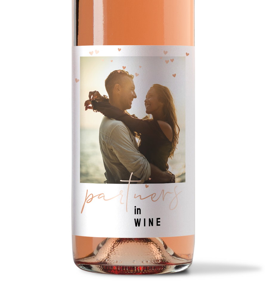 Wie is jouw partner in wine? Stuur op Valentijnsdag dit originele cadeau naar jouw grote liefde. Ook hartstikke leuk om aan vriendinnen of vrienden te geven natuurlijk! Of je nu een romantisch huwelijksjubileum, een chique bruiloft of een stijlvol jubileum wilt vieren, wij hebben het perfecte ontwerp voor jou. Zet op dit wijnetiket een foto van jullie als stralend stel. Het gebruik van glanzende roséfolie geeft een luxe uitstraling aan dit etiket.