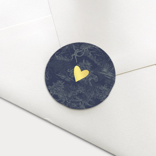 Ronde blauwe sticker met jungle thema en goudfolie hartje. Deze stickers passen supergoed bij de geboortekaartjes geïnspireerd op het kaartje van Esther Vedder.