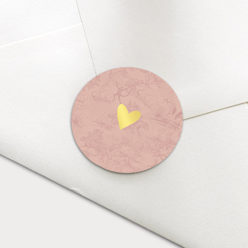 Ronde sticker met goudfolie hartje, passend bij de geboortekaartjes geïnspireerd op het kaartje van Esther Vedder. Deze luxe sticker heeft een zachte oudroze kleur met een jungle print met panter, aapje, tijger en bomen en takken. Door de zachte roze kleuren krijgt deze sticker een vintage uitstraling.